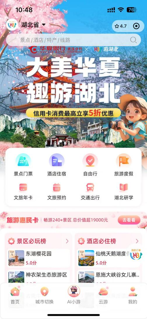 在數(shù)字化消費場景深度融合的背景下,雙方構(gòu)建“三重惠民”服務(wù)體系:一是消費立減,用戶通過“游湖北”微信小程序預(yù)訂景區(qū)門票、精品酒店、特色年卡及品質(zhì)跟團游產(chǎn)品時,使用微信支付(綁定華夏銀行信用卡),可享最高5折優(yōu)惠,單筆立減50元封頂;二是場景互通,整合省內(nèi)熱門景區(qū)、優(yōu)質(zhì)酒店資源形成消費矩陣;三是長效賦能,通過“月月享優(yōu)惠”機制(每自然月限享1次)持續(xù)激發(fā)消費活力。