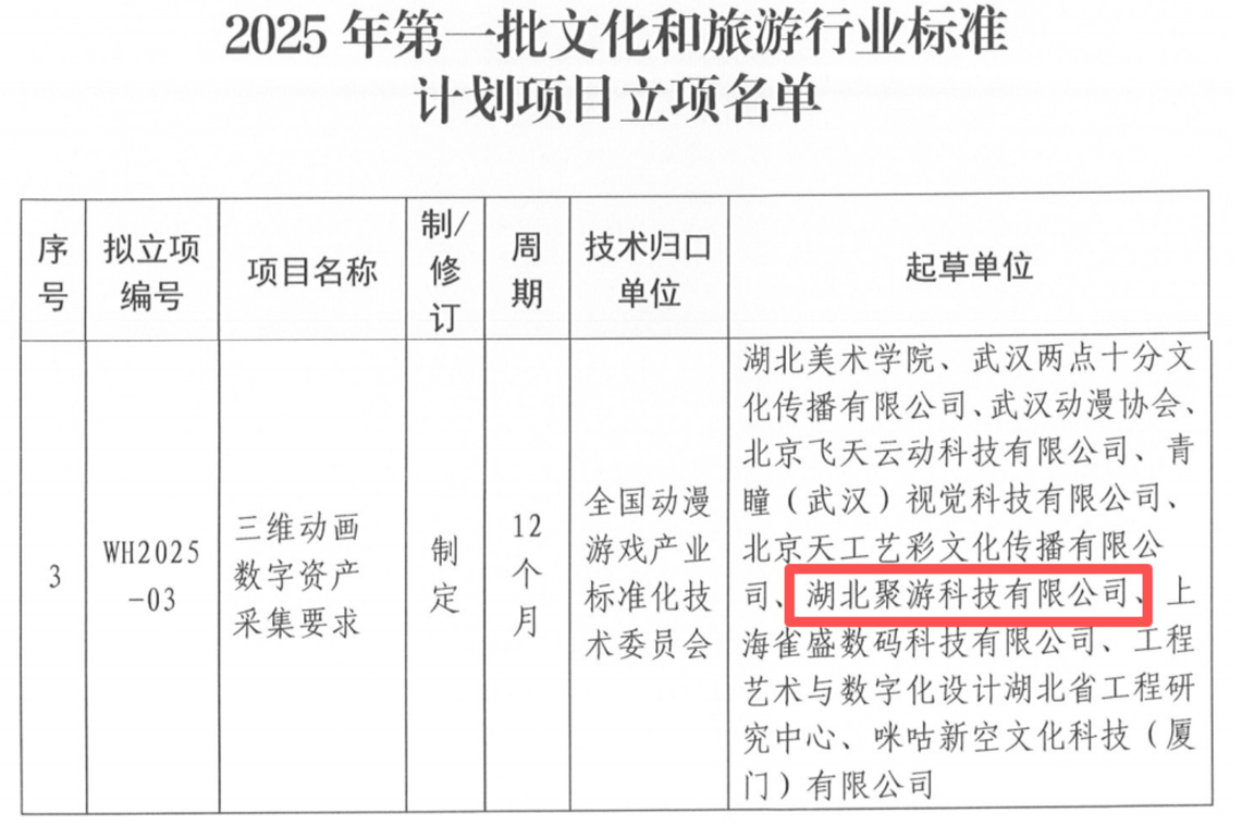 近日,文化和旅游部科技教育司發(fā)布了2025年第一批文化和旅游標(biāo)準(zhǔn)計劃項目立項名單。由數(shù)旅集團旗下聚游科技參與制定的《三維動畫數(shù)字資產(chǎn)采集要求》成功入選,實現(xiàn)了在文旅行業(yè)標(biāo)準(zhǔn)化領(lǐng)域的重大突破。