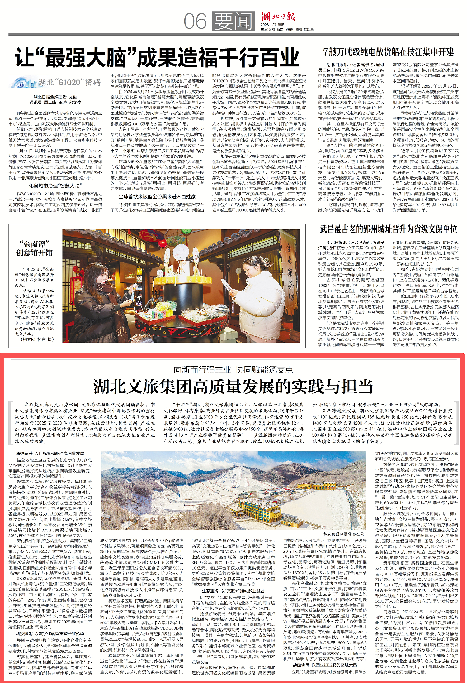 湖北日報丨向新而行強主業(yè) 協(xié)同賦能筑支點 湖北文旅集團高質量發(fā)展的實踐與擔當。湖北文旅集團作為省屬國有企業(yè),錨定“加快建成中部地區(qū)崛起的重要戰(zhàn)略支點”使命任務,以《“投身支點建設,引領文旅突破”高質量發(fā)展行動方案(2025至2030年)》為藍圖,在經營效能、科技創(chuàng)新、產業(yè)生態(tài)、戰(zhàn)略協(xié)同四大領域精準發(fā)力,推動集團從平臺型向實體型、傳統(tǒng)型向現代型、資源型向創(chuàng)新型轉型,為湖北培育萬億級文旅支柱產業(yè)注入強勁動能。未來,集團將在經營效能上求突破、科技創(chuàng)新上謀發(fā)展、產業(yè)生態(tài)上做文章、戰(zhàn)略協(xié)同上顯擔當,以文化創(chuàng)新引領產業(yè)發(fā)展,在湖北建設世界知名文化旅游目的地的藍圖中發(fā)揮龍頭作用,為中部地區(qū)崛起重要戰(zhàn)略支點建設貢獻更大力量。